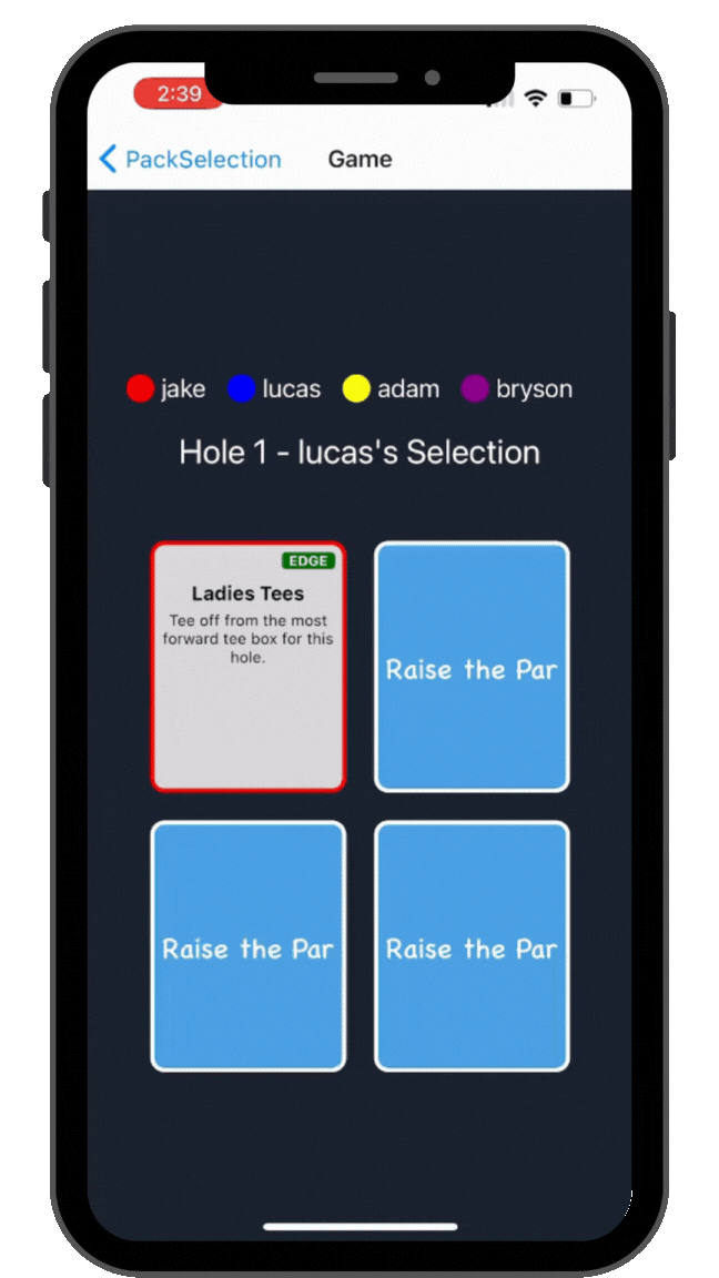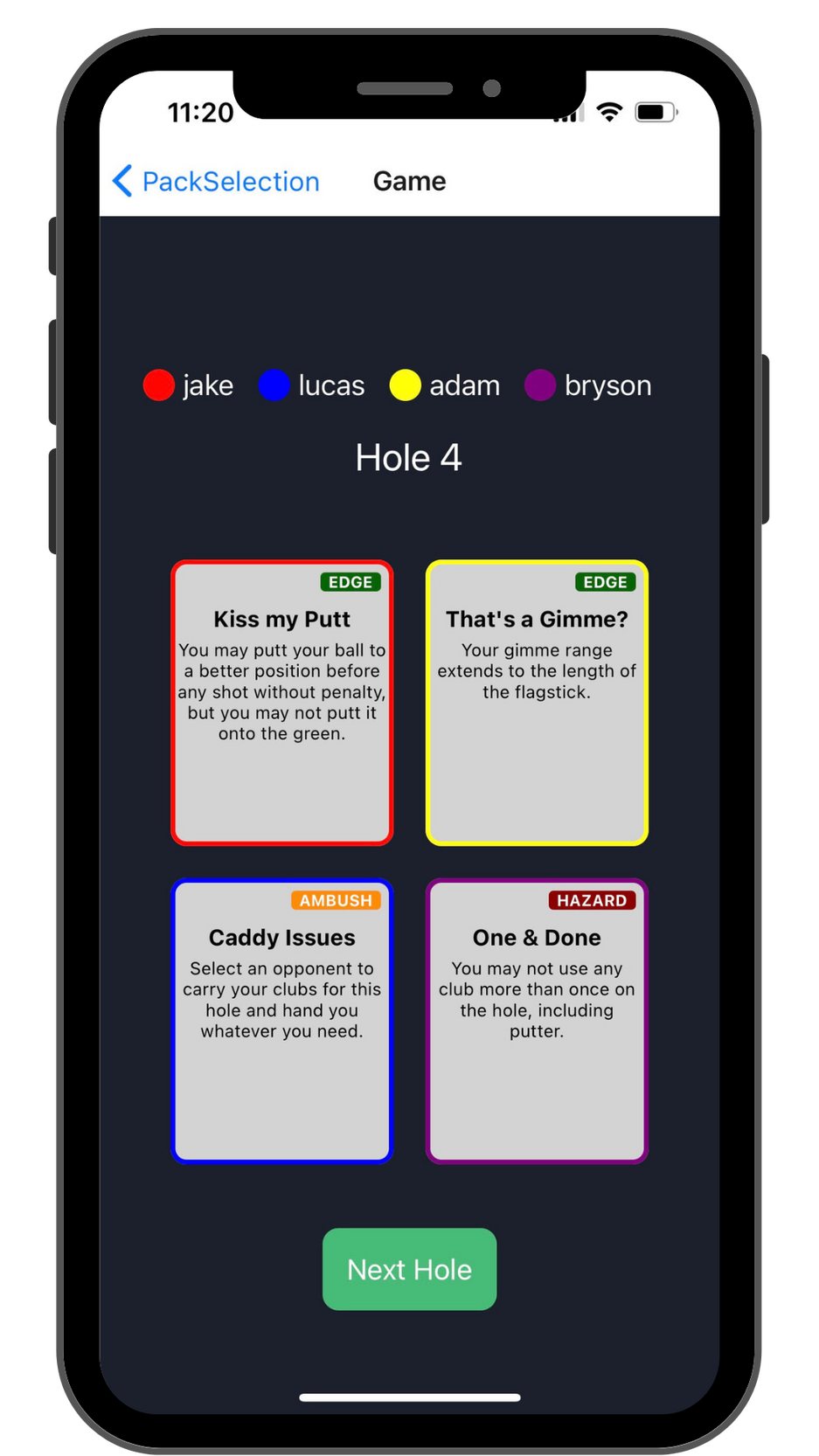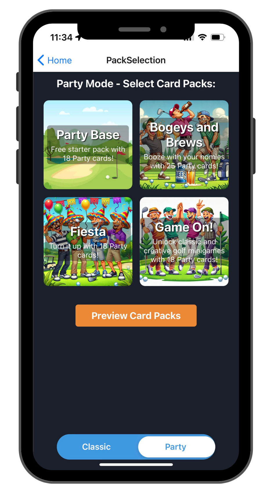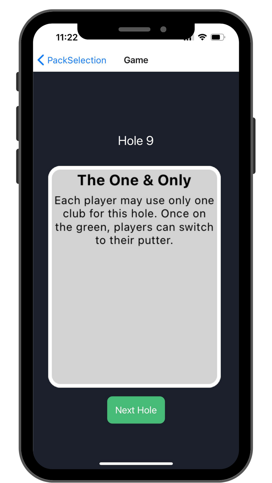 * Party: A single card is drawn that applies to the entire group for that hole.3. Select the card packs you'd like to play with. Feel free to mix and match different packs.4. Before teeing off on each hole, select cards based on the game mode. After completing the hole, press "Next Hole."Notes:
